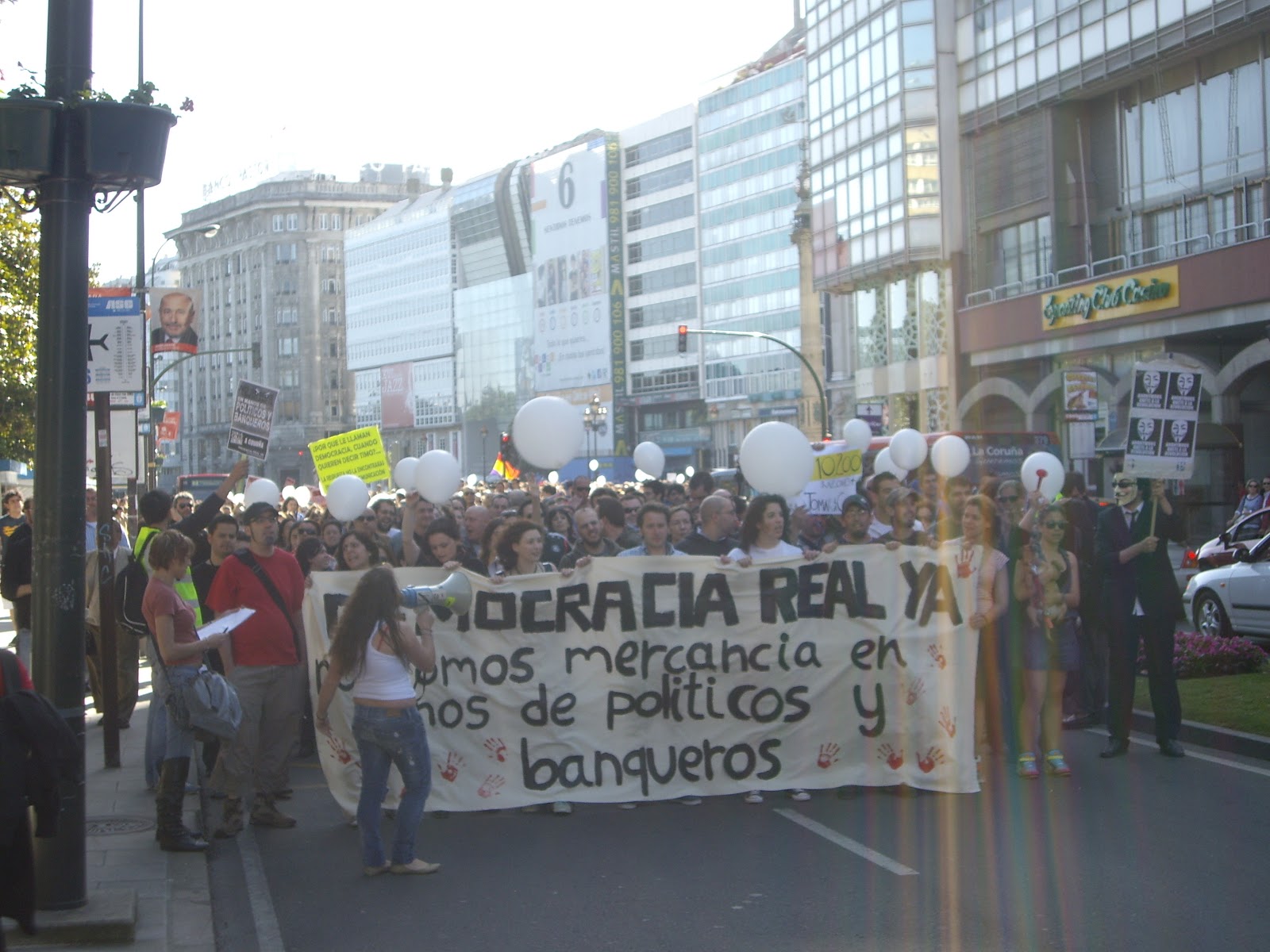 Hoy por la tarde, en paralelo con otras manifesticiones en más de 50 ciudades españolas, luego de un compás de espera razonable para dar tiempo a todos los participantes a incorporarse, se ha desarrollado sin incidentes dignos de mención la manifestación de convocada por el colectivo "Democracia real ya".